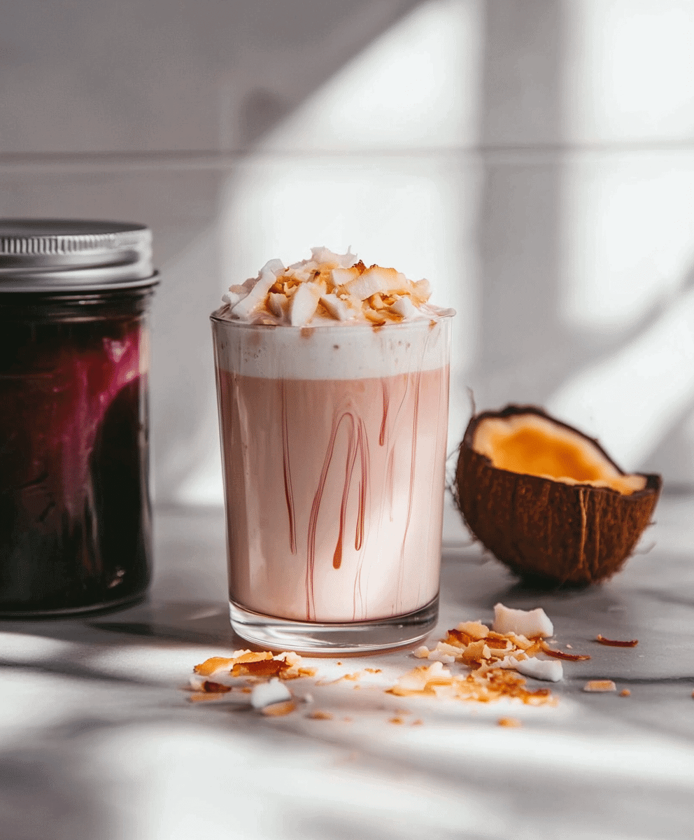 This Pink Coconut Iced Latte recipe blends creamy coconut milk, sweetener, and vibrant beet juice for a naturally pink, dairy-free summer drink. Perfect for anyone craving a tropical iced latte with a colorful twist, this refreshing beverage is vegan, healthy, and Instagram-worthy.